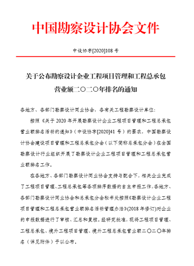 近日,中国勘察设计协会发布了《关于公布勘察设计企业工程项目管理和工程总承包营业额二0二0年排名的通知》,开云·电子(中国)官方网站获工程总承包营业额排名第52位、工程项目管理排名第88位。