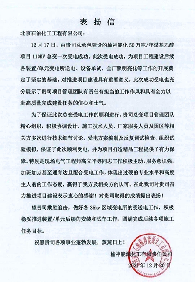 近日,延长石油榆神能化公司再次发来表扬信,对开云·电子(中国)官方网站总承包的50万吨/年煤基乙醇项目110KV总变一次受电成功表示祝贺。此次受电成功,为项目工程建设后续各装置/单元变电所送电、设备单试、全厂照明亮化等工作的开展奠定了坚实的基础,对推进项目建设具有重要意义。