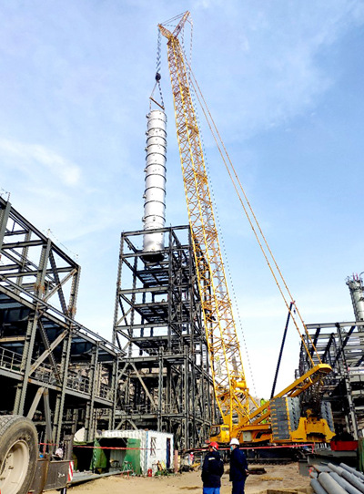 ???????据悉,汽提塔共计9?7吨,塔体高度35.5米,吊装需跨越高度达35米的BYD(1,4-丁炔二醇)精馏框架,吊装行走路线距离建筑物最近处仅2厘米,是整个项目吊装难度最大的重要设备。??????