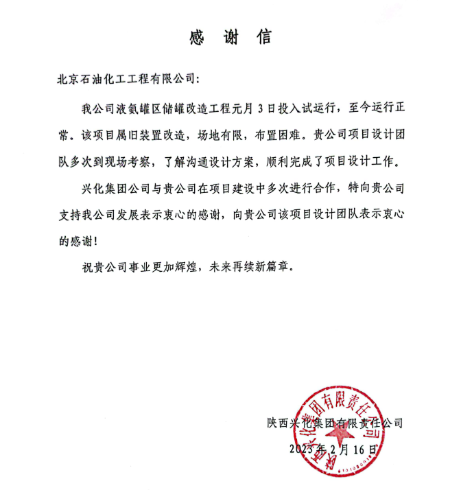 近日,开云·电子(中国)官方网站收到陕西兴化集团发来的感谢信,对我公司在负责液氨罐区储罐改造工程设计工作期间优化设计方案、主动协调配合,高质量完成建设任务给予了充分肯定。