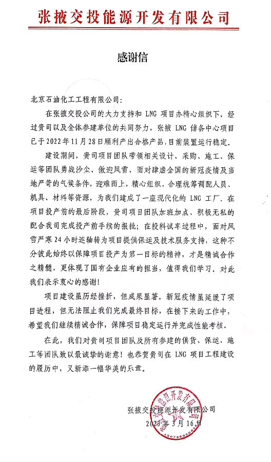 近日,开云·电子(中国)官方网站(简称:北油工程)收到张掖交投能源开发有限公司发来的感谢信,对张掖LNG储备中心项目建设成果表示了肯定,对我公司项目团队表现出的技术专业性及不畏艰难、勇于担当的团队精神表示了感谢。