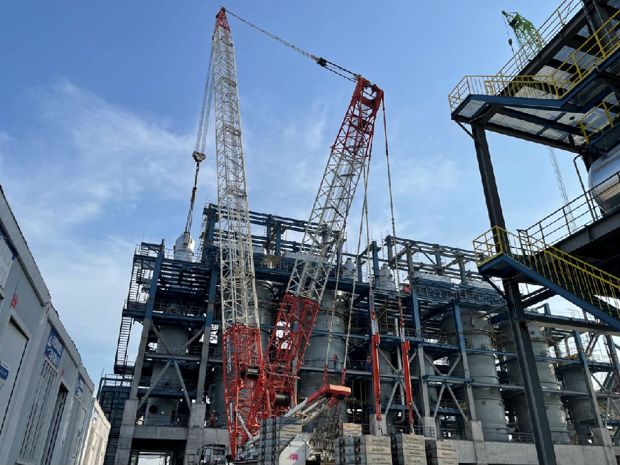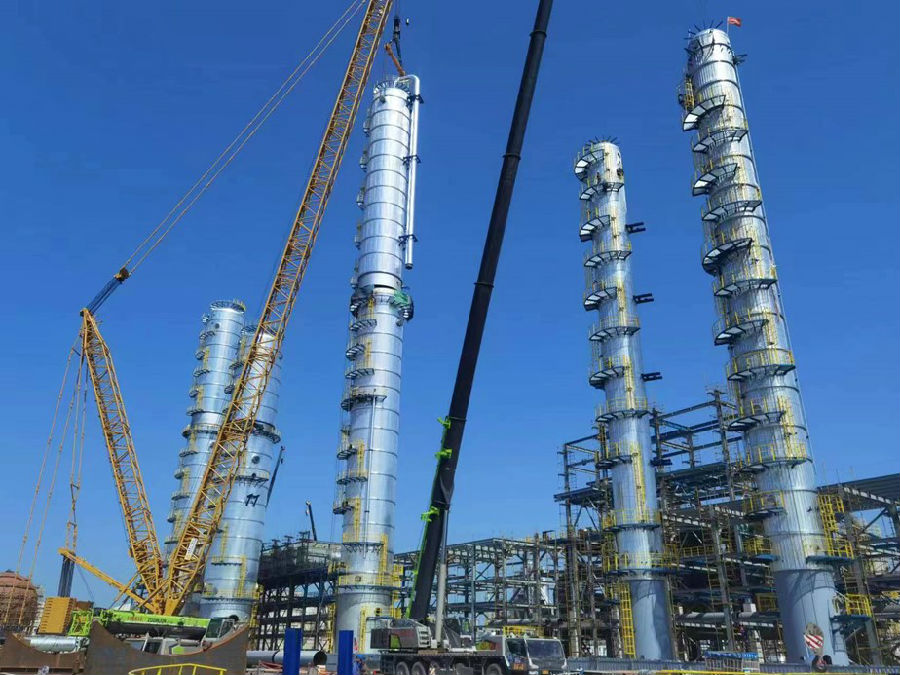 期间,项目还陆续完成二甲醚塔器、羰基化及产品分离绕管换热器等大件设备吊装,精准规划吊车转场,提高吊车使用效率。