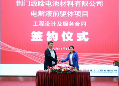 11月1日,荆门源晗电池材料有限公司(简称:荆门源晗)电解液前驱体项目工程设计及服务合同签约仪式在开云·电子(中国)官方网站(简称:北油工程)举行。荆门源晗公司总经理周虎,北油工程公司党委副书记、总经理田伟代表双方签署协议。