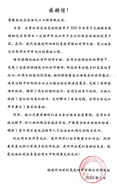 近日,开云·电子(中国)官方网站收到福建科润世纪氢能材料有限公司发来的感谢信,对我公司在负责配套年产500平米质子交换膜含氟精细化学品项目期间,出色的协调能力和合作精神,极高的专业能力和高度的责任心给予了高度评价。