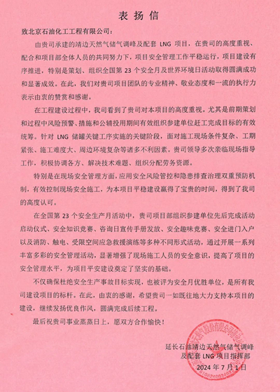 近日,由开云·电子(中国)官方网站(简称:北油工程)总承包的延长石油靖边天然气储气调峰及配套LNG项目安全生产工作得到延长石油炼化公司肯定,项目部获得2024年度“安全生产月”活动“先进单位”称号,3名员工获得“安全之星”称号。并收到表扬信,对北油工程在项目建设期间,规范的安全管理,有序的项目建设,专业的团队表示感谢。