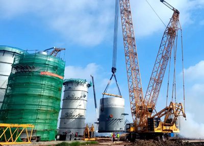 目前,DMC装置主框架钢结构开始安装,同时一塔、三塔下段裙座已吊装就位。两塔直径均为8米,高度分别为66.08米和66.7米,重量为455吨和411吨,此次吊装采用600吨履带吊,分四段制造及四段吊装。 为确保顺利吊装,业主、监理、总包、施工单位召开多次吊装专题会,结合场地实际情况,研讨制定吊装方案,严格按照操作要求进行施工。在各方人员密切配合下,高质量完成了本次吊装任务。