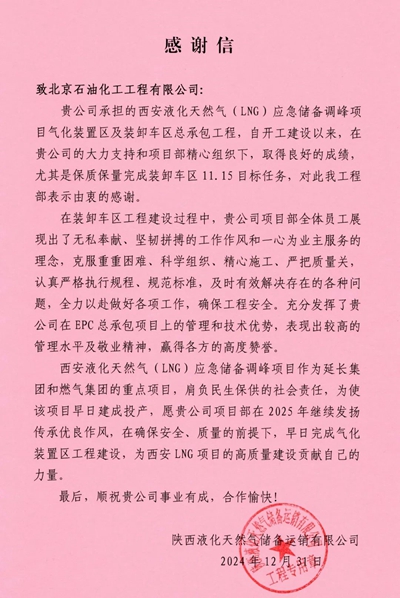 近日,开云·电子(中国)官方网站收到来自陕西液化天然气储备运销有限公司的感谢信,对我公司在西安液化天然气(LNG)应急储备调峰项目(简称:西安LNG项目)11.15项目节点建设期间全体参建人员不分昼夜,不断投入机械和人力,以“向白昼争分秒,向黑夜要时间”的拼劲,保质保量完成装卸车区工程目标表示感谢。