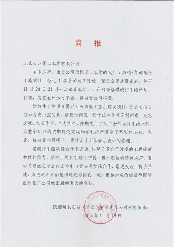由我公司设计的陕西延长石油(集团)有限责任公司延安炼油厂7万吨/年醋酸仲丁酯项目,经过近1年的设计、采购和施工建设,整个工程已全部建设完成,2013年11月28日一次试车成功,生产出合格的醋酸仲丁酯产品,目前各装置生产运行平稳。为此,业主单位特向我公司发来喜报。